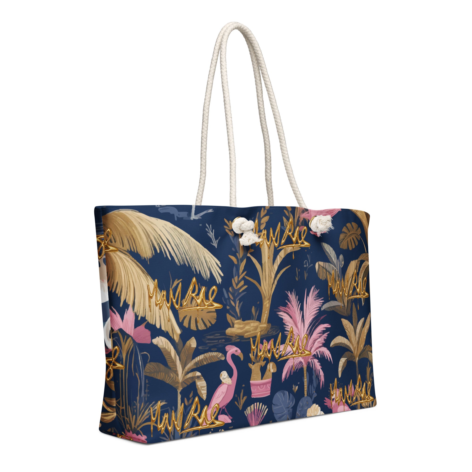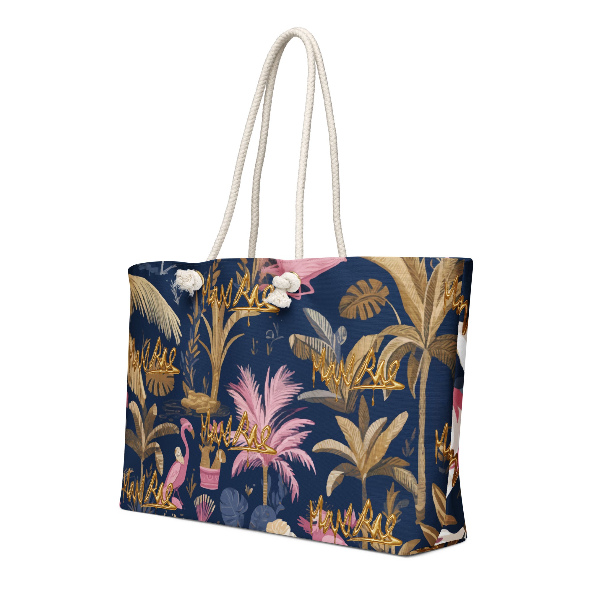 • Cream-colored cotton rope handles through metal grommets
